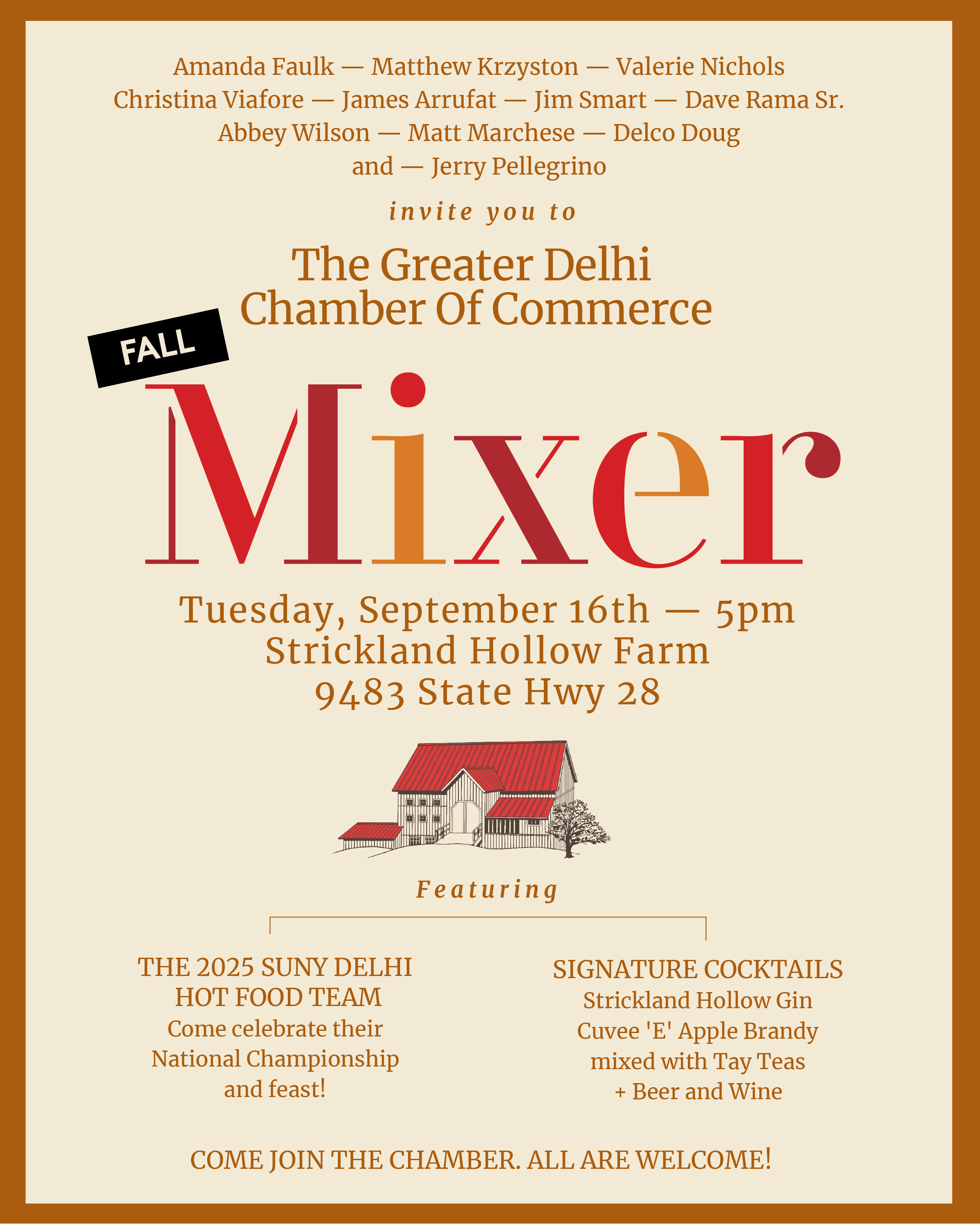 The Fall Chamber Mixer is coming up this Tuesday, September 16th at 5pm at the gorgeous Strickland Hollow Farm in Meridale, NY! Food will be prepared by the SUNY Delhi Hot Food Team, signature cocktails will be served up from the Strickland Hollow distillery, and there will be plenty of mingling and mixing with business owners and community members. We can’t wait to see you there!