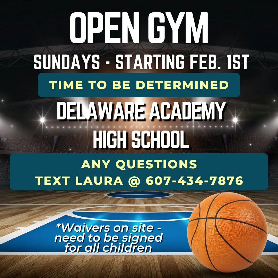 Delaware Academy High School has announced Open Gym days every Sunday beginning February 1. Follow our social media channels and Delaware Academy for updates on times, waivers, and all information needed for your family to participate each Sunday. More information to follow. If you have any specific questions, you are invited to text Laura at 607.434.7876.